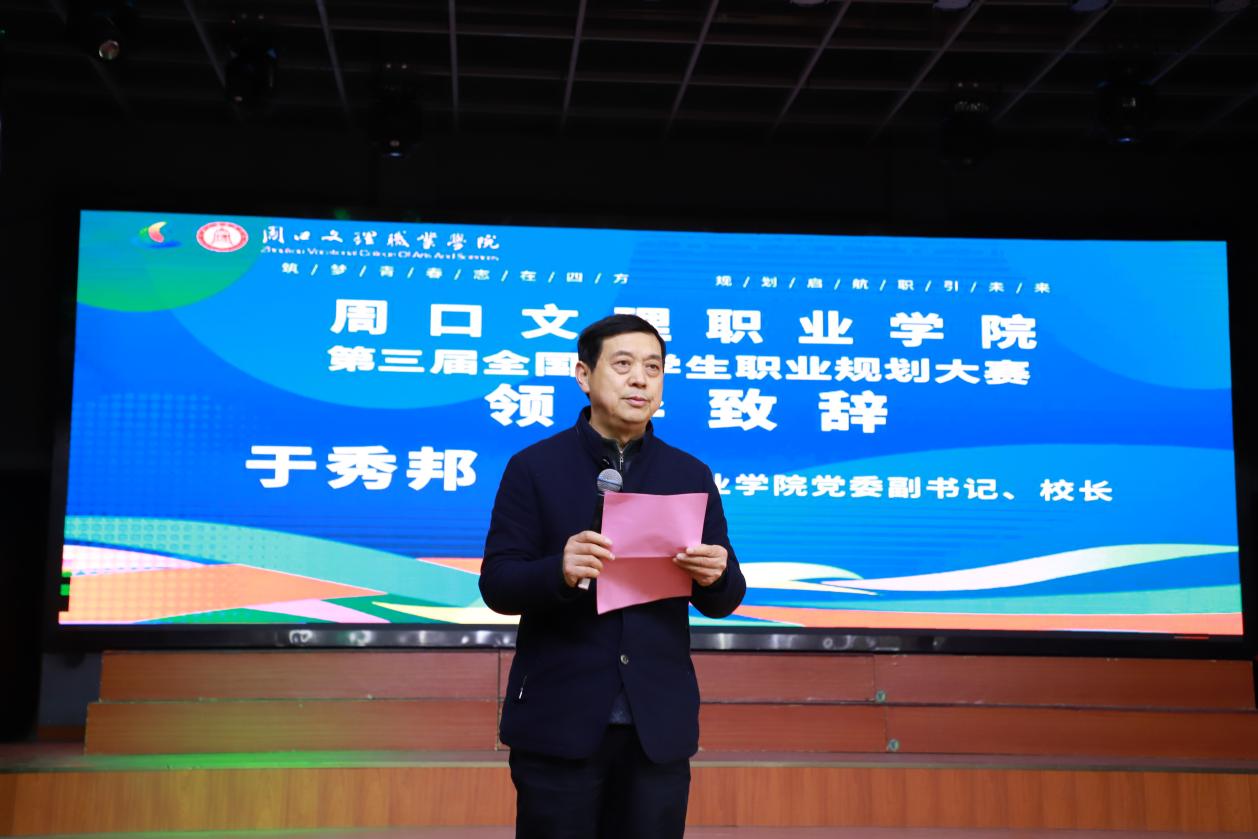 为引导大学生树立正确的职业观,科学规划职业生涯,提升就业竞争力,12月26日,周口文理职业学院“规划启航,职引未来”第三届大学生职业规划大赛校级决赛在学校演播厅成功举办。校长于秀邦出席活动并致辞,副校长武金娟、招生就业科及各二级学院负责人等出席活动。